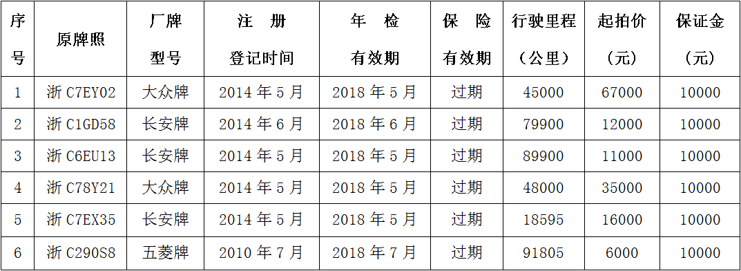 受委托,定于2018年5月31日上午10时整,在瑞安市飞云街道办事处五楼会议室对下述6辆二手车(不包括原牌照)进行公开拍卖,现将有关事项公告如下:
