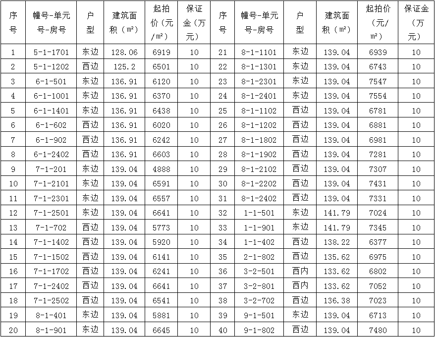 一、标的及起拍价:标的为坐落于瑞安市飞云街道如意家园共40套住宅房产,土地性质为出让,详见下表: