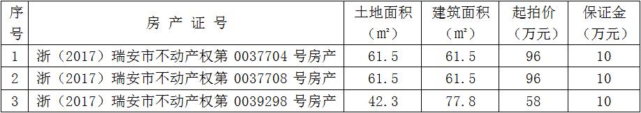 一、标的说明:标的为坐落于瑞安市飞云街道桥里村的3间房产,权利性质为批准拨用/自建房,用途为农村宅基地/住宅。详见下表: