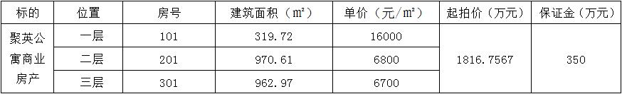 一、标的说明:标的为坐落于瑞安市罗阳大道聚英公寓1-3层的商业房产,详见下表: