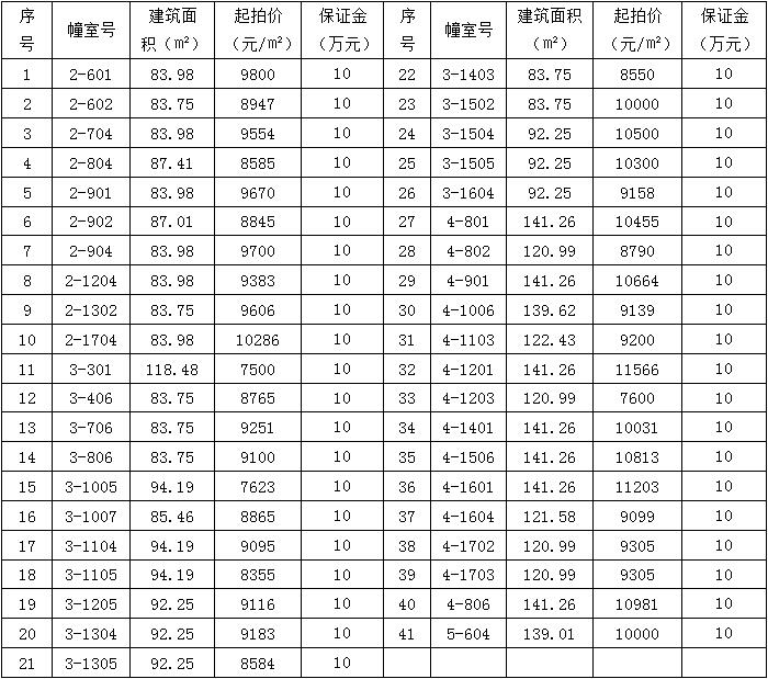 一、标的及起拍价:标的为坐落于瑞安经济开发区开发区大道北侧的大桥花苑共41套住宅房产,土地性质为出让,详见下表: