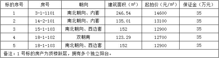 一、标的说明:标的为坐落于瑞安市安阳街道集云佳园共5套一手现房,土地性质均为国有出让,详见下表: