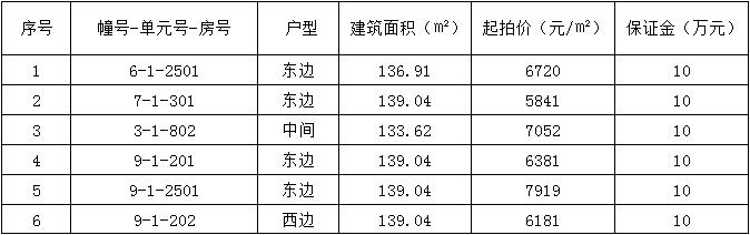一、标的及起拍价:标的为坐落于瑞安市飞云街道如意家园共6套住宅房产,土地性质为出让,详见下表: