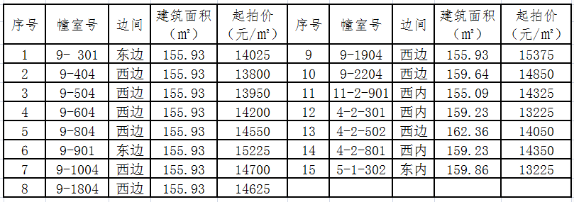 一、拍卖标的:标的为坐落于瑞安市安阳街道白岩桥村的白岩桥佳园共15套住宅房产,土地性质为划拨,竞买保证金为30万元/套,详见下表: