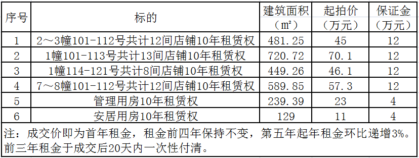 一、标的说明:标的为瑞安市马屿镇马南村南阳名居商业店铺及配套房产的10年租赁权,详见下表: