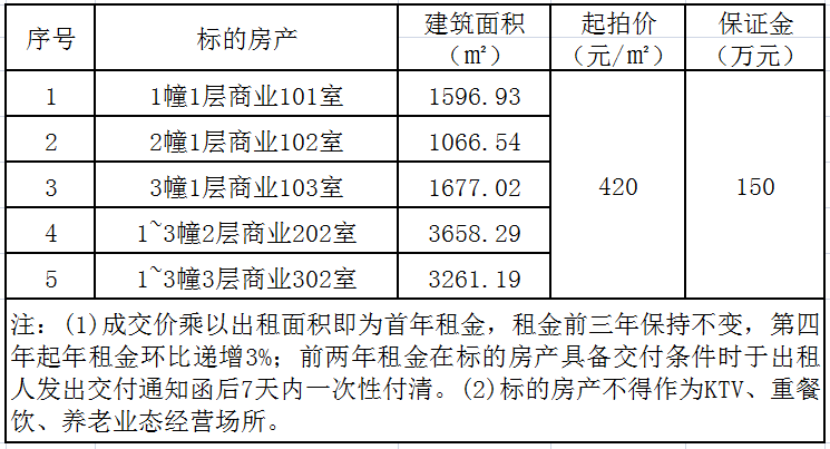 一、标的说明:标的为坐落于瑞安市安阳街道佳欣华庭约11259.97㎡商业房产的12年租赁权(捆绑拍卖),详见下表:
