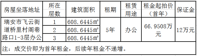 经瑞安市机关事务管理中心批准,温州中正拍卖有限公司受瑞安市良种繁育场委托,定于2020年12月21日14时30分,在瑞安市公共资源交易中心对下列房屋进行公开招租,公告如下: