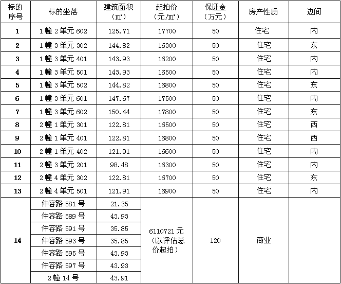 1、本次拍卖采用保留价等于起拍价的增价式拍卖。