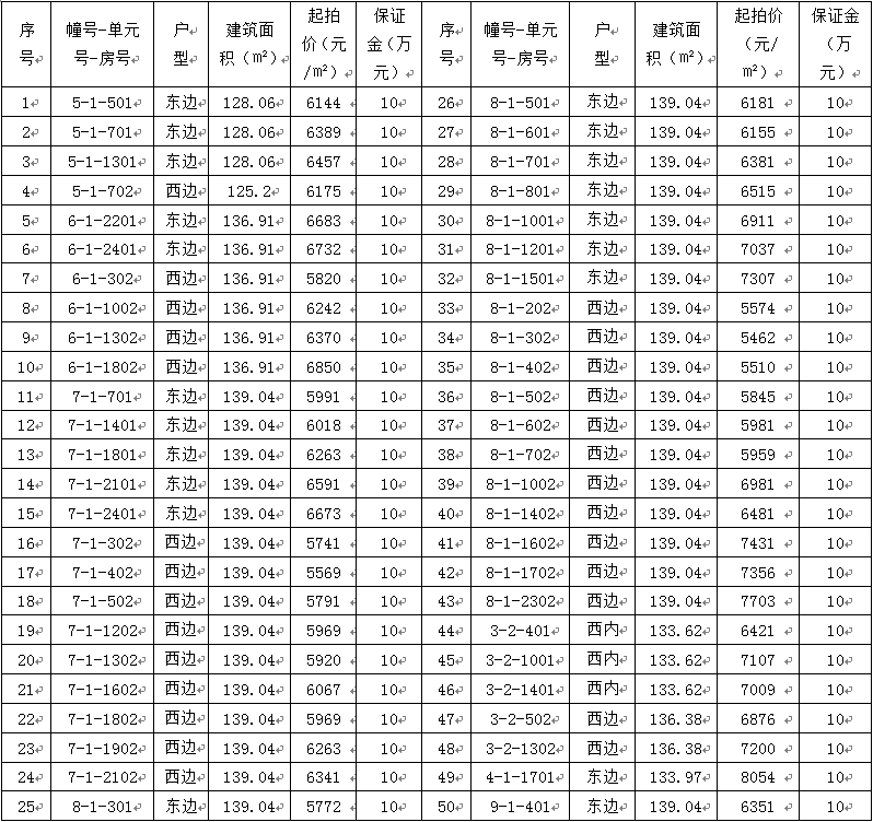 一、标的及起拍价:标的为坐落于瑞安市飞云街道下厂村的如意家园共50套住宅房产,土地性质为出让,详见下表: